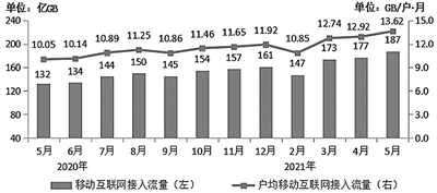 移动互联网流量大幅增长,DOU值屡创新高。1-5月,移动互联网累计流量达846亿GB,同比增长38.5%,实现连续三个月提速增长。其中,通过手机上网的流量达到811亿GB,同比增长37.4%,占移动互联网总流量的95.8%。5月,当月户均移动互联网接入流量(DOU)达到13.62GB/户·月,同比增长35.6%,比上年底高1.7GB/户·月,达到DOU新高值。