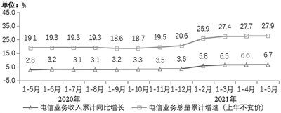 电信业务收入稳中有升。1-5月,电信业务收入累计完成6127亿元,同比增长6.7%,两年平均增速为4.7%,增速较疫情前的2019年同期提升6.4个百分点。按照上年不变价计算的电信业务总量为6578亿元,同比增长27.9%。