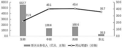 东部地区新兴业务收入规模明显领先,中西部地区增长迅猛。1-5月,东、中、西和东北地区分别完成新兴业务收入552.7亿元、138.6亿元、168.6亿元和35.3亿元,同比分别增长21.9%、40.1%、40.4%和35.7%;在各自电信业务收入中的占比分别达到17.8%、11.6%、11.7%和10.7%,其中北京、上海新兴业务收入占比已超25%。