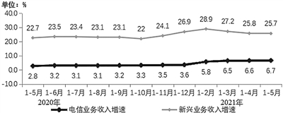 新兴业务收入持续较快增长。三家基础电信企业积极发展IPTV、互联网数据中心、大数据、云计算等新兴业务,1-5月共完成新兴业务收入918亿元,同比增长25.7%,在电信业务收入中占比为15%,拉动电信业务收入增长3.3个百分点。其中,云计算和大数据业务增势最为突出,收入同比增长分别达94.7%和35.3%,共占新兴业务收入的16.8%,占比同比提升5.6个百分点。